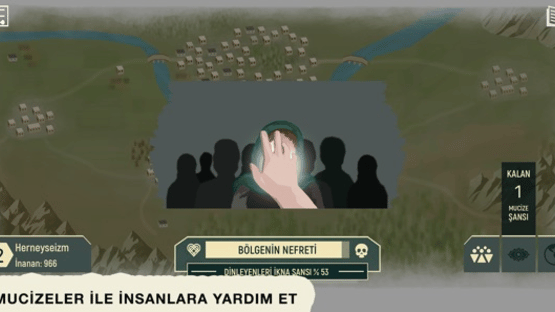 Can you convince the whole world? A new belief has emerged, and you have been chosen to spread it. Humanity will always have reasons to hate you, so you must use your words, miracles, and improvements to make your religion believed worldwide. You should talk to people without earning their hatred, travel through cities, and correct mistakes with your miracles. In your journey starting from Egypt, Jerusalem, or Rome, you will encounter hundreds of stories and people. While trying to spread your belief worldwide, you will reach one of twenty different endings. Throughout your adventure, you can develop yourself to reach more believers, perform miracles, and create disasters to enhance your religion. As the effects of your words create chaos in the world, you must create a religion that all of humanity believes in by dealing with people's hatred, lies, kings, and demons.