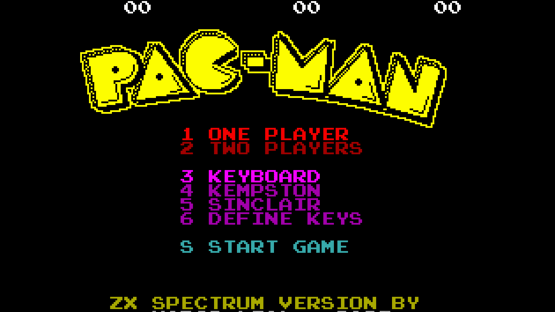 This is a faithful conversion of the original Pac-Man arcade for the ZX Spectrum 48K. Everything was recreated with as much detail as possible through hours of reading of multiple Pac-Man guides and playing the original game. Being a conversion, some concessions were made to work around the limitations of the 48K but the overall result is still pretty close. The game runs at a silky smooth 50fps with game sound and no tearing or flickering. All the level progression, logic, rules and timings are implemented exactly like the arcade. All the intermissions are included at the end of the right levels. All the ghost logic was replicated exactly as the original. A fix has been made to Inky's logic which had a bug in the original. Game does not "crash" like the original arcade at the end of level 256. It simply ends with a Game Over. It also supports a 2 Players game like the arcade.