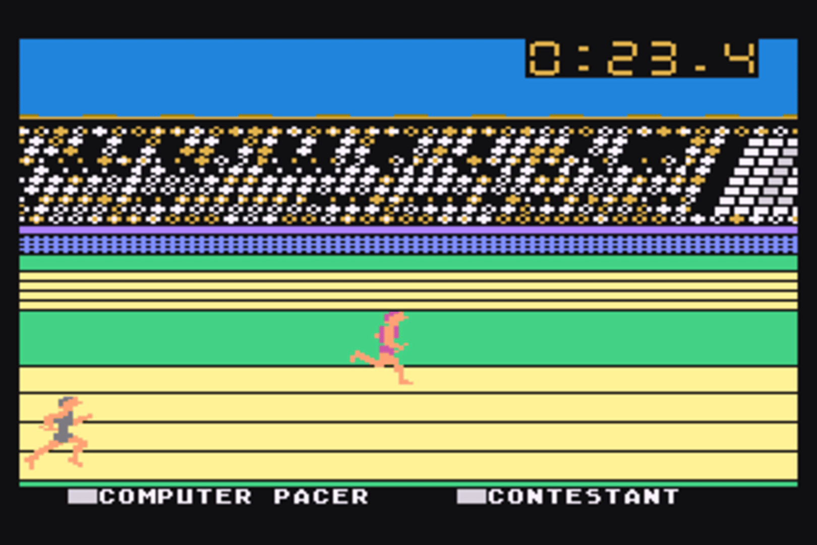 A port of "Summer Games" for the Atari 8-bit. Summer Games allows up to eight players to compete in a series of summer themed Olympic events. The gameplay is similar to the other entries in Epyx "games" series. Each player can choose a country to represent, and then takes turns competing in various events to see who will win the gold medal! The game allows you to compete in all of the events sequentially, choose a few events, choose just one event, or practice an event. The events available vary slightly depending on the platform, and may include: - Pole vault - Platform diving - 4x400 meter relay - 100 meter dash - Gymnastics - Freestyle swimming - Skeet shooting - 100 meter freestyle - Rowing