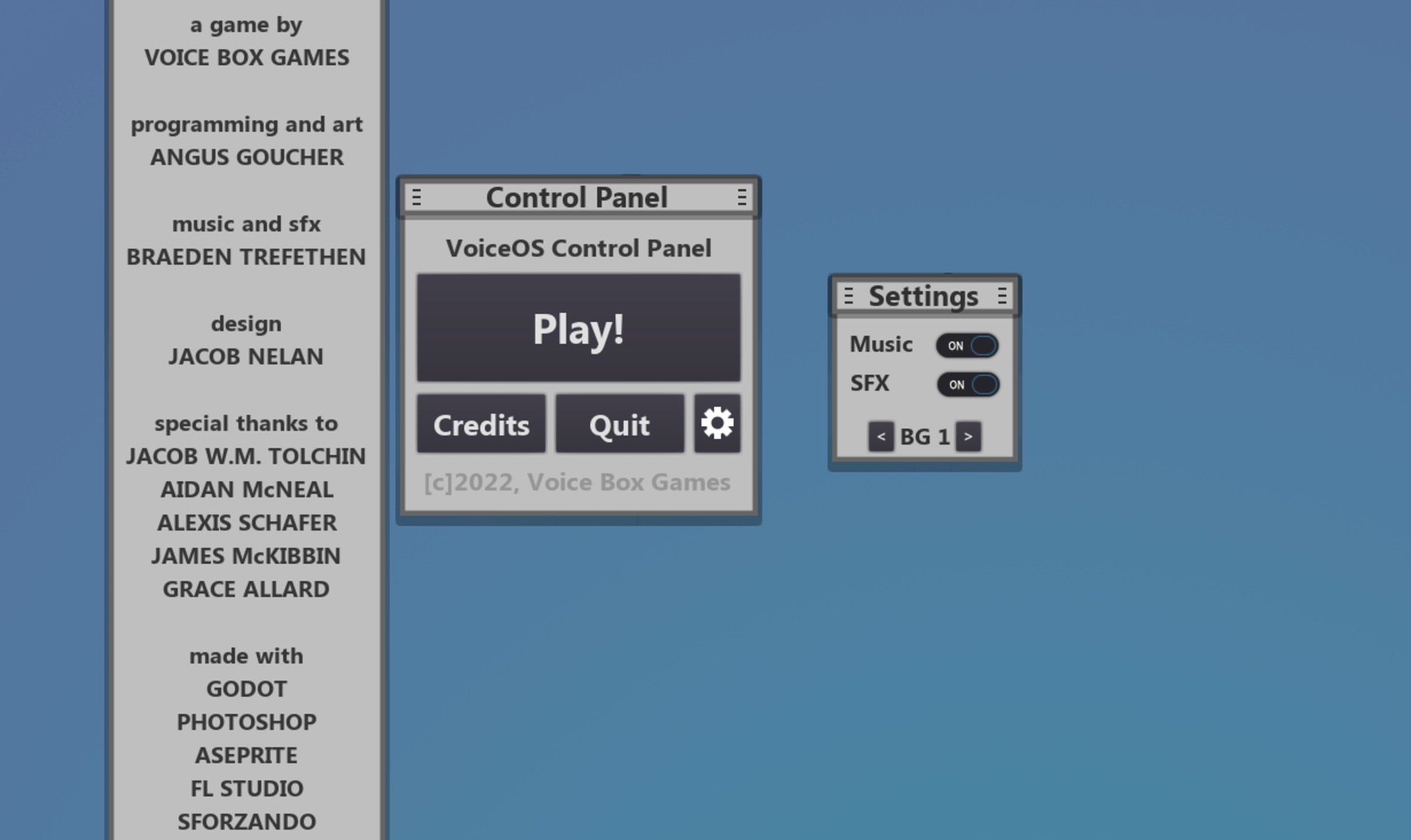 Voice Box Games comin' back at ya with a Tubular, High-Res experience for your home computer! No more driving all the way to the arcade to play your favorites: just play VoiceOS, a short game about doing too much all at once! Made for Mini Jam 100 by Angus Goucher, Braeden Trefethen, and Jacob Nelan.