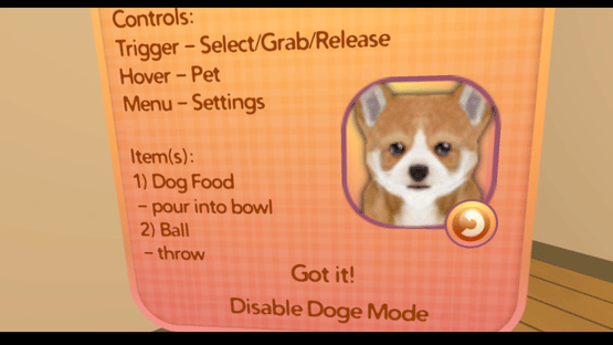 Puppy Doge VR offers a light VR experience where players casually interact with a puppy. features: choose from 3 different puppies pet puppies by stroking their fur feed or play fetch Optional "Doge Mode" inspired by internet meme Disclaimer: this basic simulation DOES NOT feature mechanics such as growth or obedience training. This is not a full blown pet game.