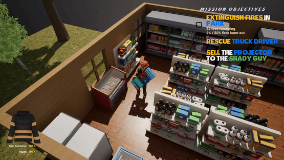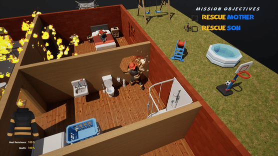 Twin-stick action fire fighting game. Extinguish fires, rescue citizens, and protect property... at least until you steal it. Sneak past other fire fighters and police to sell your stolen loot while trying to keep the fire under control.