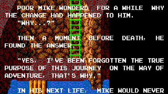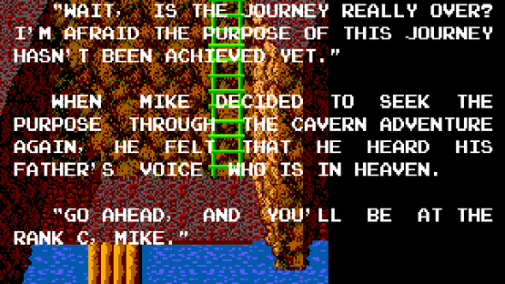 Having lost their parents in a plane crash, Mike and Lisa try to persevere through their broken childhood. The boy still wonders about the bottomless cave he was warned away from, though, and one day curiosity gets the better of him. Mike wanders into the darkness alone, seeking adventure and closure. This action-platformer tasks players with solving each of 10 stages' puzzles and secrets to reach the end. It uses simple arcade-style controls and mechanics, akin to early-'80s classics such as Pitfall II and Tower of Druaga. Kill more creatures than required and you might get the "bad" ending; satisfy just each level's conditions to reach the "good" one and play the game's second loop. Mike's Lonely Journey saw release on the short-lived FM-77AV platform, with an FM-7 port having fewer levels and downgraded presentation. Oh! FM Magazine distributed and produced the game, while its developers soon moved on to companies like Namco and Tengen.