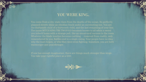 Create a King by choosing the origins, title, and infamous event of a ruler. A unique story will generate that outlines your King's reign, and how it ends...