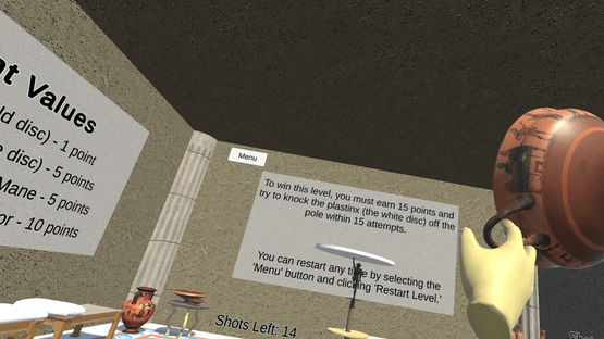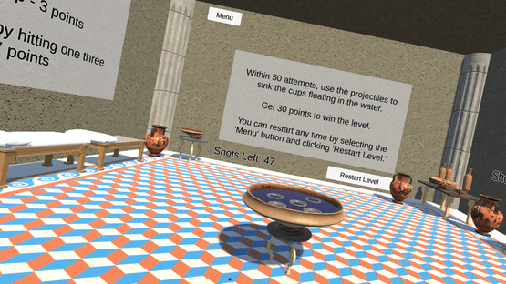 This is a VR trip into the ancient world - playing Kottabos, the all-time favorite Greek party game. Prove your skill by throwing the dregs of wine from your cup at the metal disk on the pole in front of you, or fling your drops at the little cups floating in a bowl.
