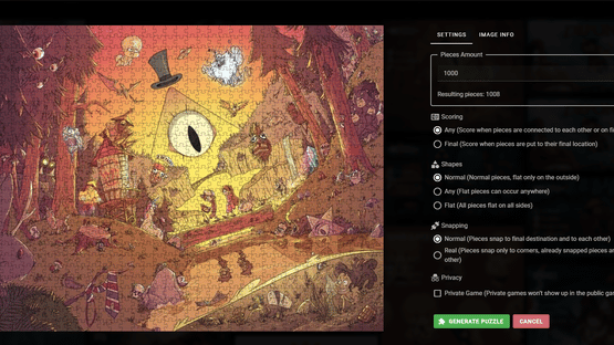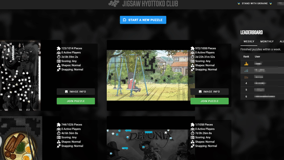 Jigsaw Hyottoko Club is an Open-source multiplayer jigsaw puzzle game, which is played in the browser. You can enjoy a relaxing puzzle online with your friends. There is also the option to upload your own images and puzzle them together. There are various settings, including private games, adjust number of pieces for puzzles, as well as different piece style mode (for example completely flat pieces), different scoring modes and various piece snap modes. The game can be played as guest or as a logged in user. Logged in users who finish puzzles will show up on the leaderboards. There is also a feature that allows you to watch replays and create time lapse videos from it.