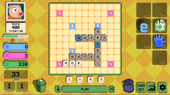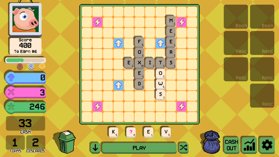 Bringing roguelike mechanics to classic word games. Use relics to create powerful combos, play boons to craft you tiles and board, use your powers to defeat a host of tricky opponents.