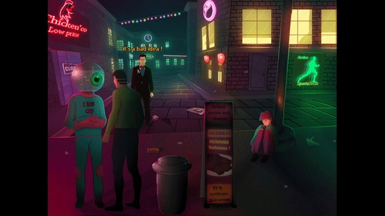 An adventure game set in a dystopian future with strange characters, a gigantic asylum and tasty burgers.