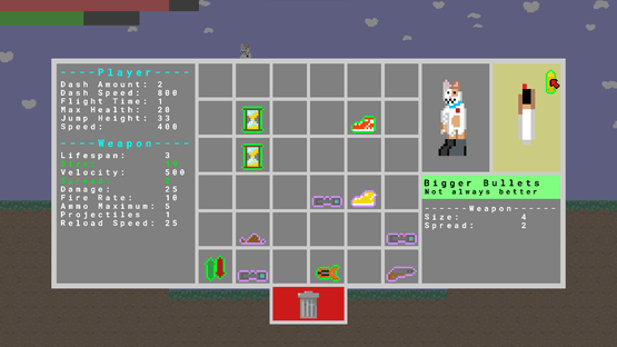 A fast-paced, side-scrolling, bullet hell with an inventory system where a player can upgrade their weapons and player stats to survive as long as possible.