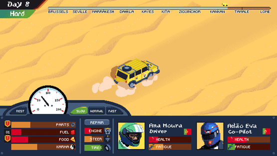 Embark on a thrilling rally adventure across Europe and Africa in Desert Race Adventures! Manage your team, vehicle, and resources strategically to navigate treacherous terrains and claim victory. Every decision counts in this intense desert racing challenge. Will you lead your team to glory?