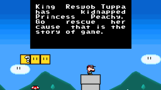 The Evil Reswob Tuppa has kidnapped the Princess of the Mushroomy Kingdom and took her to his unknown base. To get there our hero "Mario" must find the four switches to rebuild the path to reach Reswobs Hideout! Super "Mario" World is a joke hack with very cartoony graphics and a shortened quest.