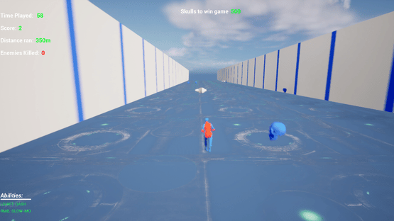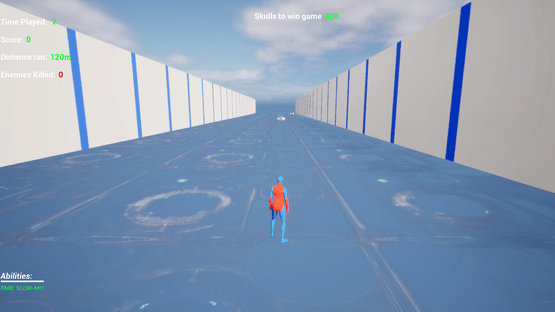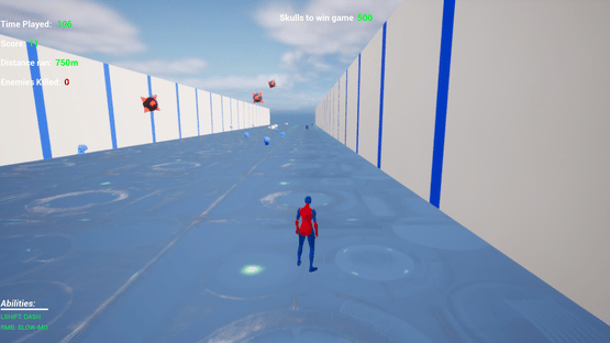 Endless Runner game where player controls cyborg, whose mission is to collect skulls and avoid spikes, moving enemies and other traps
