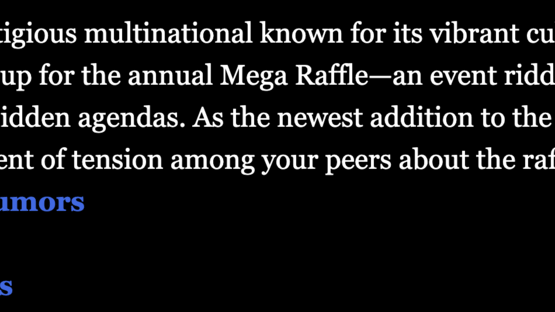 Milano’d an interactive, text-based game that plunges players into the murky depths of corporate intrigue at a multinational corporation known for its glamorous facade and secretive dealings. As the newest employee, you are thrust into the annual Mega Raffle, an event surrounded by rumors of corruption and manipulation. Navigate through a web of deceit as you decide whether to expose the wrongdoing, exploit it for personal gain, or simply try to survive your day-to-day corporate life. Your choices will lead you through conversations with allies and adversaries alike, uncovering secrets that could alter the course of your career and the integrity of MilanoCorp. Each decision shapes the narrative, leading to multiple outcomes based on your moral compass and strategic cunning. Can you unravel the truth without losing yourself in the process?