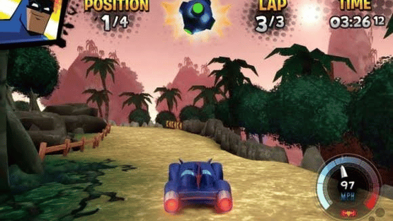 Hit the streets or take to the air in the Gotham Grand Prix! Now you can fly along with Gotham City's wildest rides! Win to unlock more bonus features. Come in first on the driving levels and watch a special video associated with each track! Come in first on any one of the flying tracks and take flight in the Batjet!