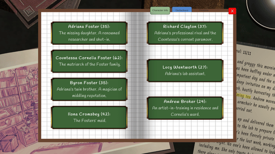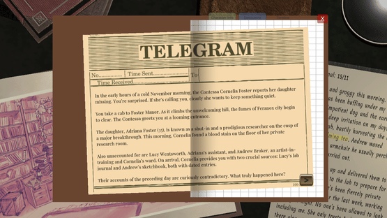 n the early hours of a dewy November day, Contessa Cornelia Foster reports her daughter, a renowned researcher and famous shut-in, missing from their manor. She was rumoured to be on the cusp of a major breakthrough. That morning, a bloodstain was found on the floor of her lab. She’s not the only one unaccounted for. Her lab assistant and an artist-in-residence are also mysteriously absent. Your clues are two crucial sources: A diary entry from the lab assistant and a sketch from the artist-in-residence, both dated the previous day. Their accounts are curiously contradictory. Can you solve the inherent contradictions to crack the case of what truly happened?