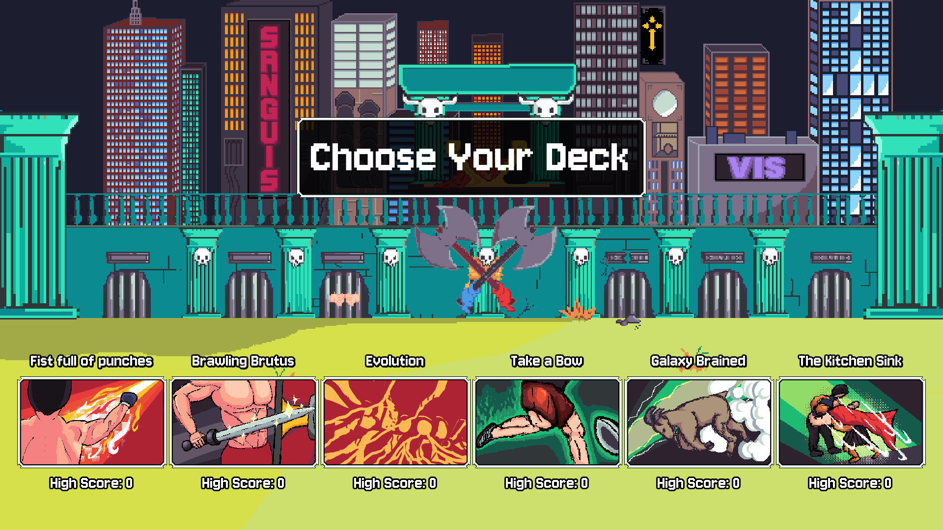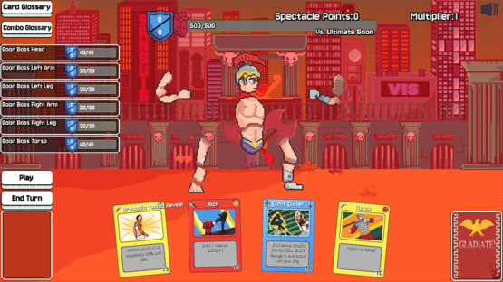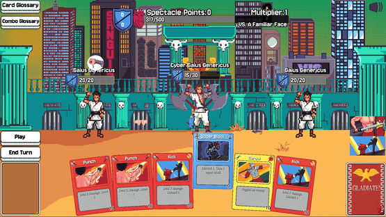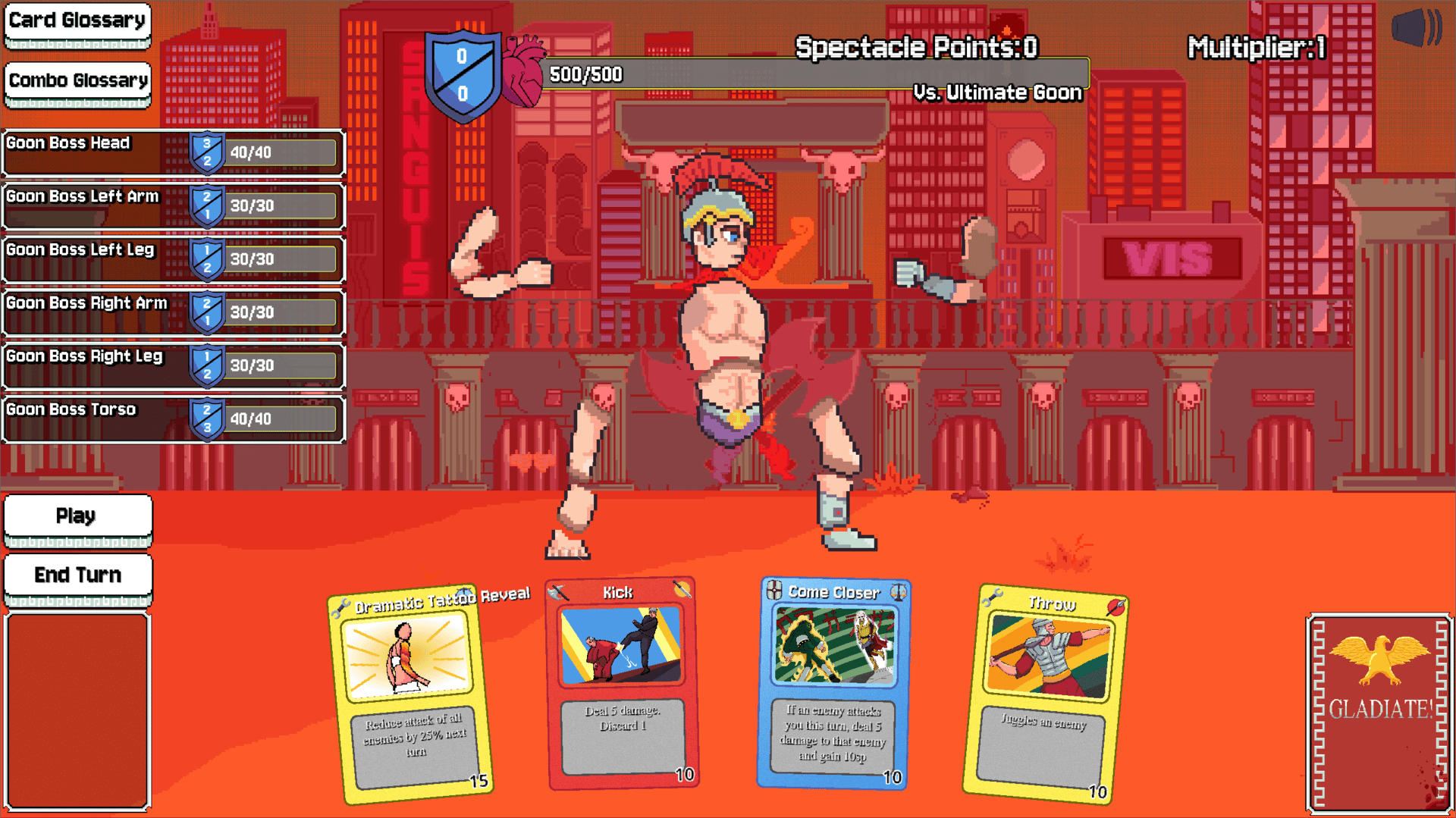 A Spectacle Fighter Card Game. Play with 6 unique decks and fight your way through a gauntlet of foes. Not only do you need to fight to survive, but also pull off combos to maximize your spectacle points and please the crowd. Can you make it to the final boss and emerge victorious?