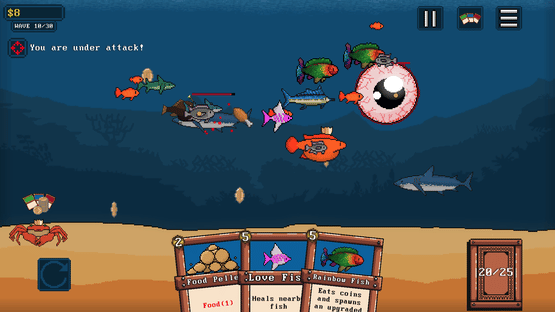 Kalasta is a roguelite deckbuilder fish game with real time strategy mechanics. Play cards to spawn fish, feed them and defend your fish from waves of monsters!