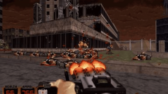 Demolition is a very gory and explosive map. The level begins with Duke cruising on into town on his bike, crashing through gates and ploughing through bad guys all in nicely explosive fashion. Almost every street building you see in the beginning is susceptible to being blown up. Even your all your weapons now have explosive properties.