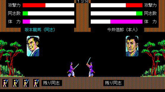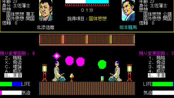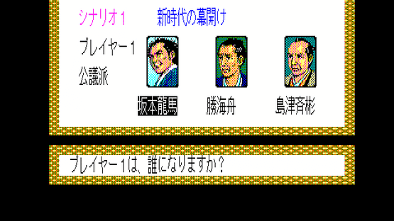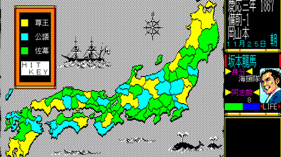 "Ishin no Arashi" was released in 1988. Its story takes place at the end of the Tokugawa Shogunate. Players become one of the 12 key figures of the time, like Ryouma Sakamoto, Kaishuu Katsu, and Takamori Saigou. They guide Japan to freedom by using persuasion and force to unify the 13 domains under one ideal, whether that is loyalty to the shogunate or the emperor, or even to the public opinion.