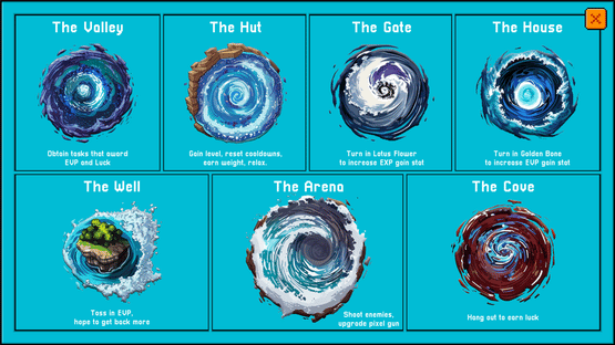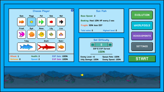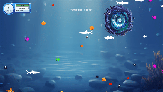 An eater with action roguelite elements. Swim around a hostile sea while you avoid dangers and eat fish to gain experience and grow. Play as one of twelve unlockable characters, each with different traits. Earn evolution points to upgrade your stats, allowing you to eat ever-larger fish.