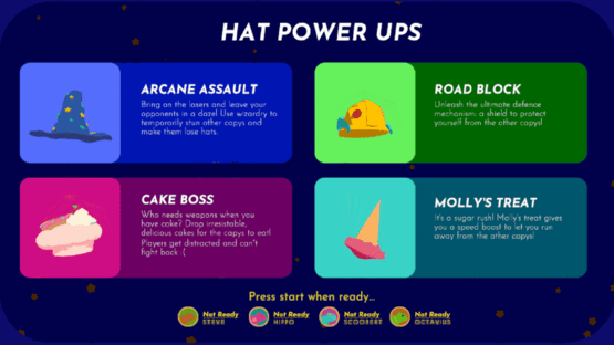 Capy Island is a party game where players, who are capybaras, play minigames on an island to collect hats. These hats will give them a step up in the final showdown where they will all battle it out. The capybara with the most hats wins!