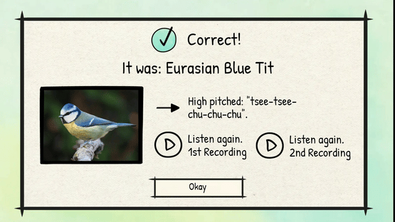 Welcome to BirdLingo, a game designed for honing your bird song recognition skills. Immerse yourself in a cute and relaxing atmosphere as you learn the songs of the 44 most common birds in Europe.