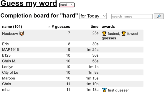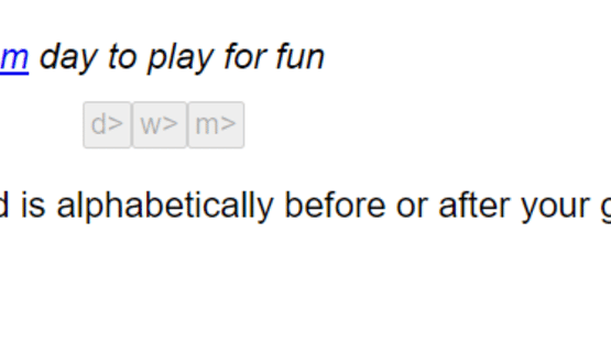 A daily word guessing game that is an unofficial clone of one that used to be available on the website simbase.org. Players select a difficulty and attempt to guess a new mystery word each day, where each guess reveals whether the mystery word appears before or after the guess's position in the dictionary. Leaderboards track the fastest finish times and the finishes with the fewest guesses. Players can also play through an archive of all previous days' challenges.