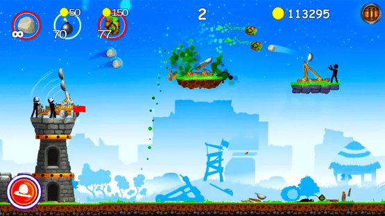 The Catapult you must help the stickman defend his castle from the siege weapons of the enemy. Use the catapult to throw stones at the opponents and break their military mechanisms and siege towers. The game has a simple intuitive control. Tap on the screen and pull to charge the catapult and select the tension force. Release to launch the projectile into the enemy. For each struck enemy you will earn coins which help you to buy upgrades shells, for example a bomb.