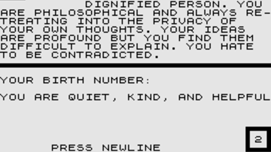 ZX Compendium is a collection of six games and programs that contains: Alien Intruder: During a long space voyage to Earth, you have been woken from cryogenic suspension to find, to your horror, the rest of the crew devoured by an alien lifeform. To prevent yourself being the next item on the menu you have decided to collect enough essential supplies before escaping in a shuttle. The game is a text adventure with some graphics where the screen is split into two. The top half shows a map of one of the three levels of the ship with your location and the aliens if on the same level as you, a map showing your immediate surrounding area and any exits, and finally the supplies you need to collect which are oxygen, cells, water and food. The bottom half of the screen has text describing your current location and you type in commands with the keyboard to interact with each location. If you enter a location with the alien then you die but if the alien enters your location then you need to deal with the situation. Wumpus Adventure: A text adventure that allows one to four players to move around an area hunting for creatures called a Wumpus to kill. Before you start the hunt you have a number of options and they are, choice of caverns (Novice, Random Cave Pattern and Professional Hunter), number of players, and if you hunt to the death or kill a certain amount of Wumpus. The actual game sees text on the screen describing each location of a player and the current player types in commands to interact with their surroundings. Each player gets one move before the next player has a turn. The players are armed with five arrows but more can be collected, and as well as Wumpus there are other creatures like Goblins and giant serpents that need to be dealt with. Numerology: A program that allows you to enter your name and birth date to receive a reading about your personality and find out your lucky number, colour and day of the week. Hangman: Based on the pen and paper game, you can compete against the computer or another person as you try to guess a word without being hanged. A word is generated and you have to select a letter at a time to try to make the word. If you guess a correct letter then it appears in the word but get one wrong and a man being hanged on a scaffold starts to appear. The computer has two levels (1-2) to choose from. Hieroglyphics: You have to decipher 39 Hieroglyphics by placing a letter or a vowel combination under the correct symbol and the computer will give you a word to help you decipher them. You must be careful in your guesses though because each wrong guess sees trapped explorer Wullie Makeit's tomb slowly fill with sand. Movie Mogul: A management game where with a limited budget you have to buy a script and attempt to make a movie and make a profit with it. After buying a script you decide which type of movie to make as well as hiring a director, actor and actress. You decide on each day of filming how much money to spend on various options watching your budget levels decrease. Once you have completed filming you are given a final score as a profit or loss for the finished movie.