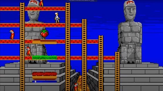 Burger Man is a straight BurgerTime variant. In each of the one-screen levels the player needs to assemble a certain number of burgers. Each burger consists of four parts which lie on the platforms. The player needs to walk over those parts and then they fall down one level - when they meet another of the parts, it also falls down. A burger is done when all four parts are on the lowest level. The platforms are interconnected with ladders which are also the only way to evade the enemies which walk around the levels (the player character can't jump). Touching an enemy results in death
