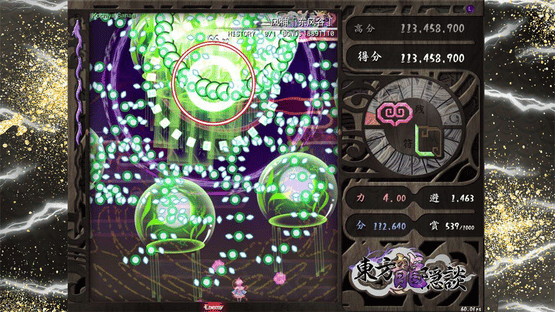 Chaos of Black Loong is a Chinese Touhou Project fangame made by LonHong Team on the LuaSTG engine. It features recurring canon Touhou characters, 6 stages plus Extra and high quality voice acting. Chaos of Black Loong reintroduces the partner mechanic. The game provides 4 playable teams with 2 characters each: Reimu Hakurei and Marisa Kirisame; Sakuya Izayoi and Hong Meiling; Koishi Komeiji and Satori Komeiji; Yukari Yakumo and Yuyuko Saigyouji The player may freely switch between the two characters of the selected team by pressing C, along with their own shot type and Spell Card. By collecting items, grazing and defeating enemies, the Reward meter on the right side of the screen increases. Once it hits 1000, the player is awarded with a Life or a Spell piece. In addition, the game introduces a new type of item - Dragon spirits. Dragon spirits are a special item that disappear after a while onscreen. They increase the value of point items and lower the Point of Collection shown by the purple bar on the left side of the screen. The player can have at maximum 9 dragon spirits, and they can be released outside of a boss' Spell Card to cancel a radius of bullets around you. If you have at least 6, getting hit will consume 5 and give you an automatic deathbomb. Additionally, the stage bosses in the game have secret Last Spells similar to Imperishable Night. When the halved sum of the current spells captured and dragon spirit count is higher or equal to the boss' total spell count, the boss' Last Spell will activate after the main battle.