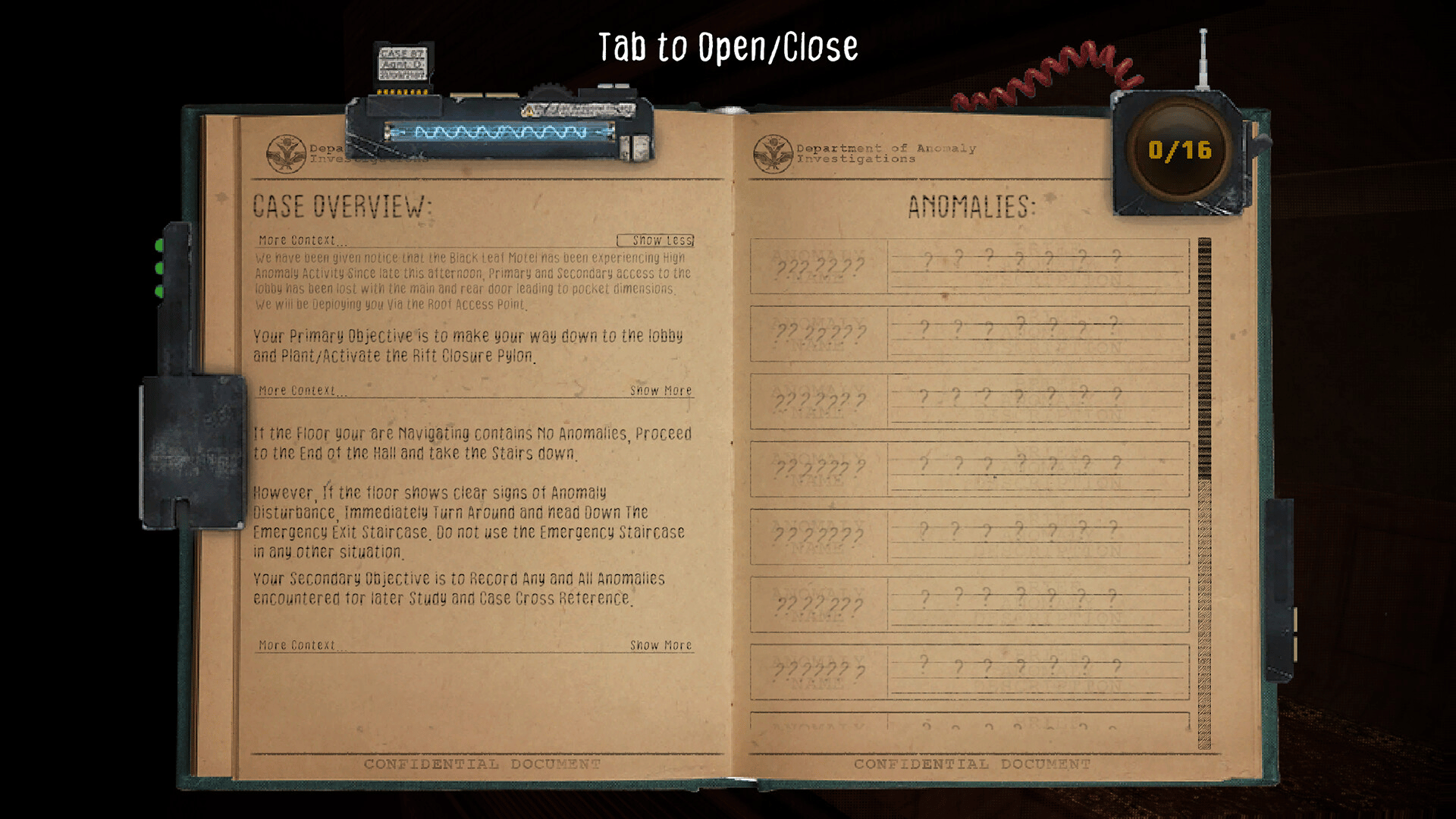 Another Anomaly, Another Mission. It's your job to work your way down the floors of the Black Maple Motel, Keep track of the anomalies, and reach the Lobby to try and safely close the Anomaly that has enveloped the building.