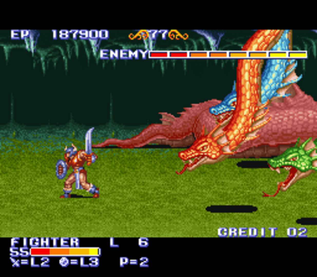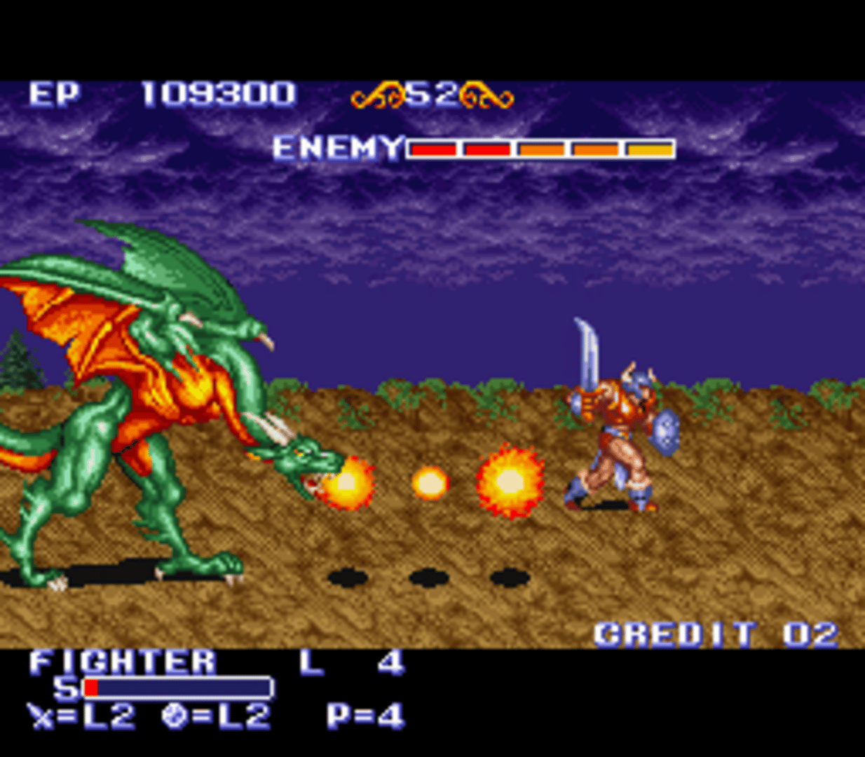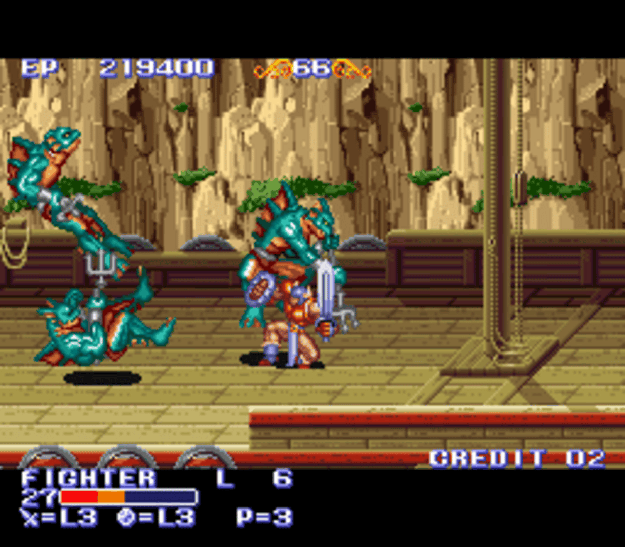 SNES Port of the arcade game with the same name. Changes it was given includes reducing the number of simultaneous players down to two, reducing the sizes of the in game sprites moderately, and it being possible to assign the magic attack and shield defense to different buttons.