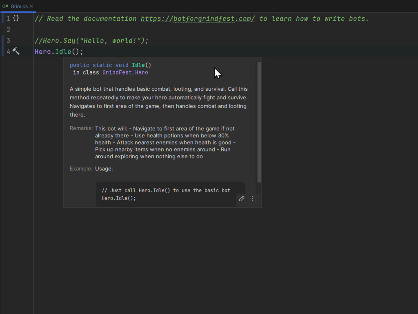 GrindFest is a free-to-play idle programming action fantasy RPG where players utilize C# programming to create bots that engage in combat, loot, and cooperate with one another.