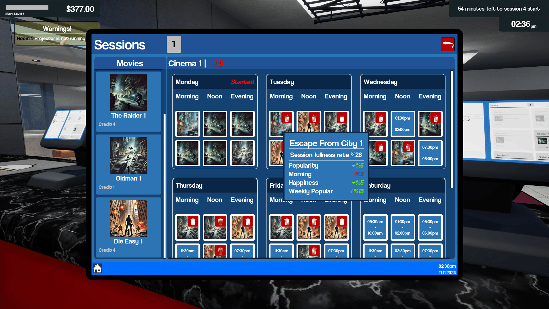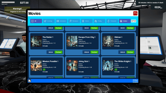 Run your own cinema! Set showtimes, print tickets, buy new films, pop popcorn, upgrade and clean theaters. Vending machines, staffs, upgrades, and much more are coming soon!