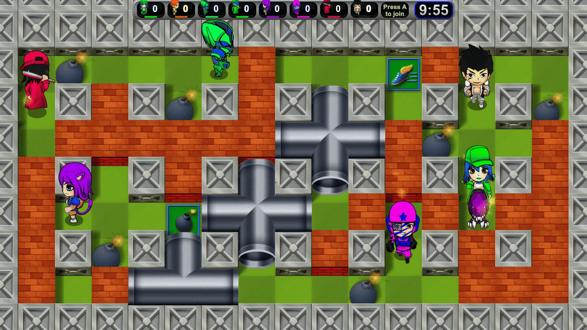 The classic couch competitive gameplay of games like Bomberman taken to the extreme. Place bombs, get out of the way, destroy your friends, collect powerups, 'splode your way to victory in smooth multiplayer with virtually unlimited local players!