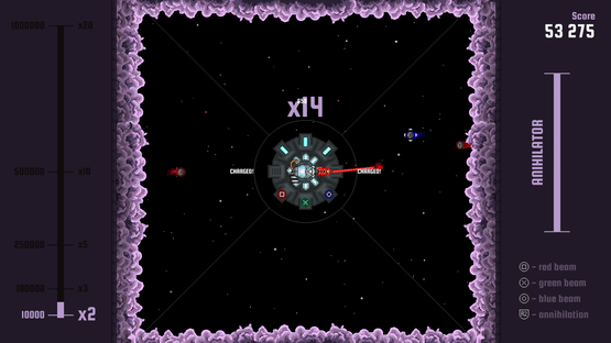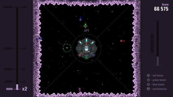 A small arcade game where the player needs to destroy asteroids of different colors using an energy beam. The cannon, controlled by the player, automatically targets the nearest asteroid but only within one of four sectors. To succeed, the player must select one of the four surrounding sectors and shoot the closest asteroid with a beam of the matching color. The score multiplier increases as long as no mistakes are made but resets to the base value if an error occurs. There is also a rank multiplier that increases upon reaching specific milestones. Scoring a million points is considered an excellent result, though it’s far from the limit. The game ends if an asteroid hits the platform three times.