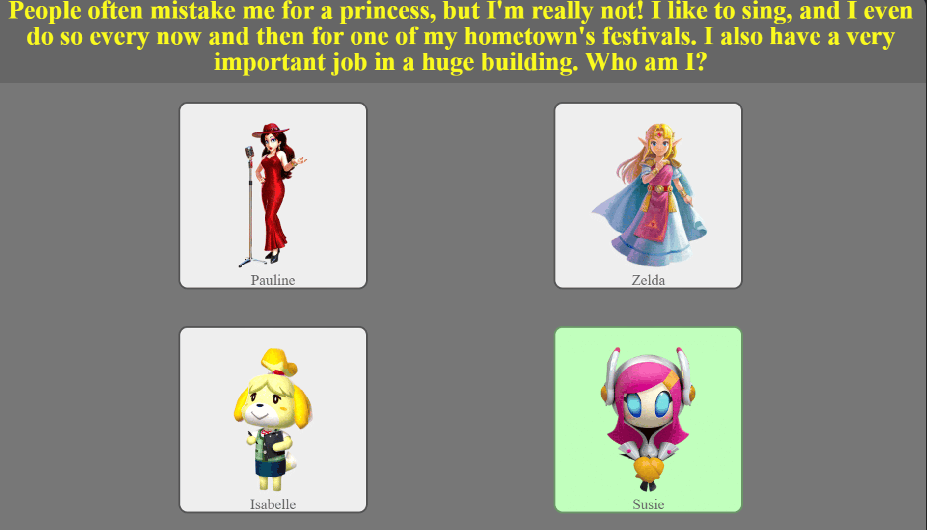 A quiz game about the spirits in Super Smash Brothers Ultimate.
