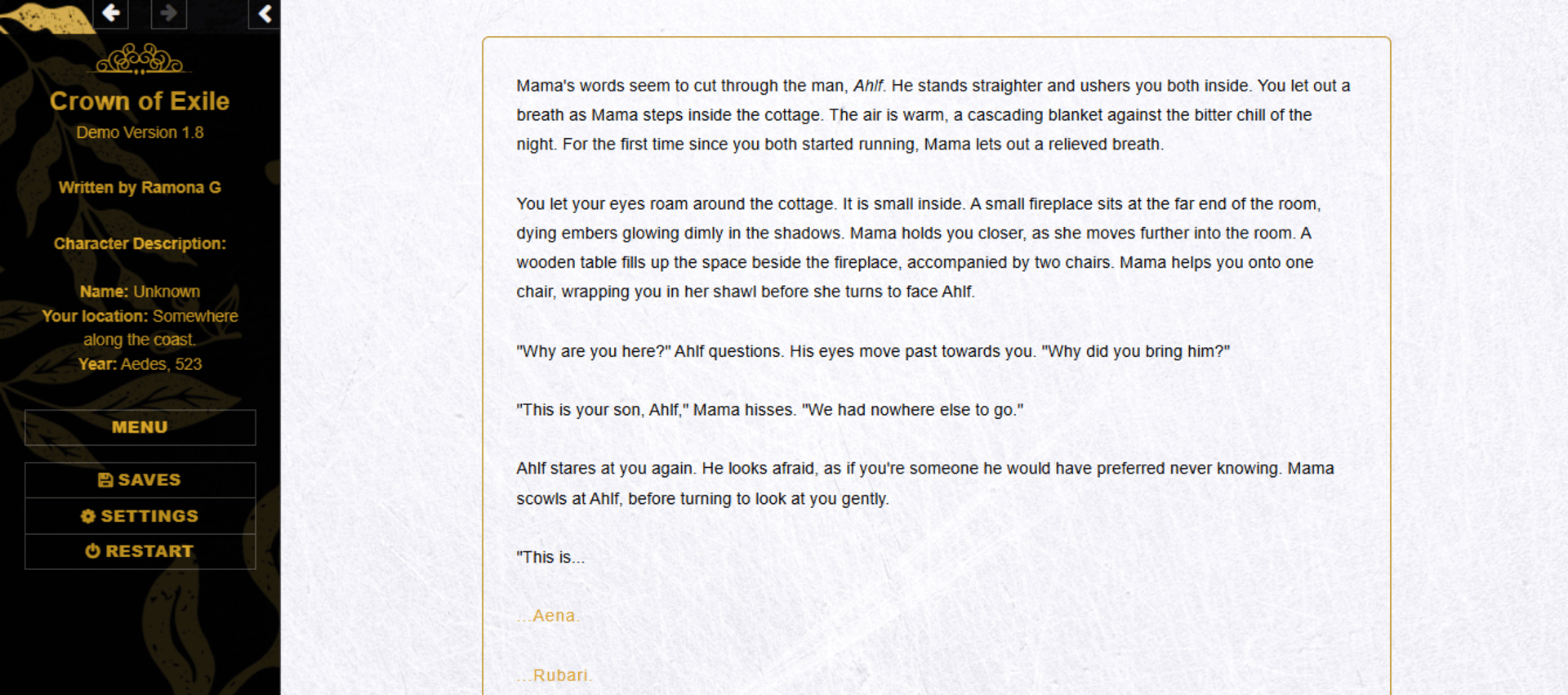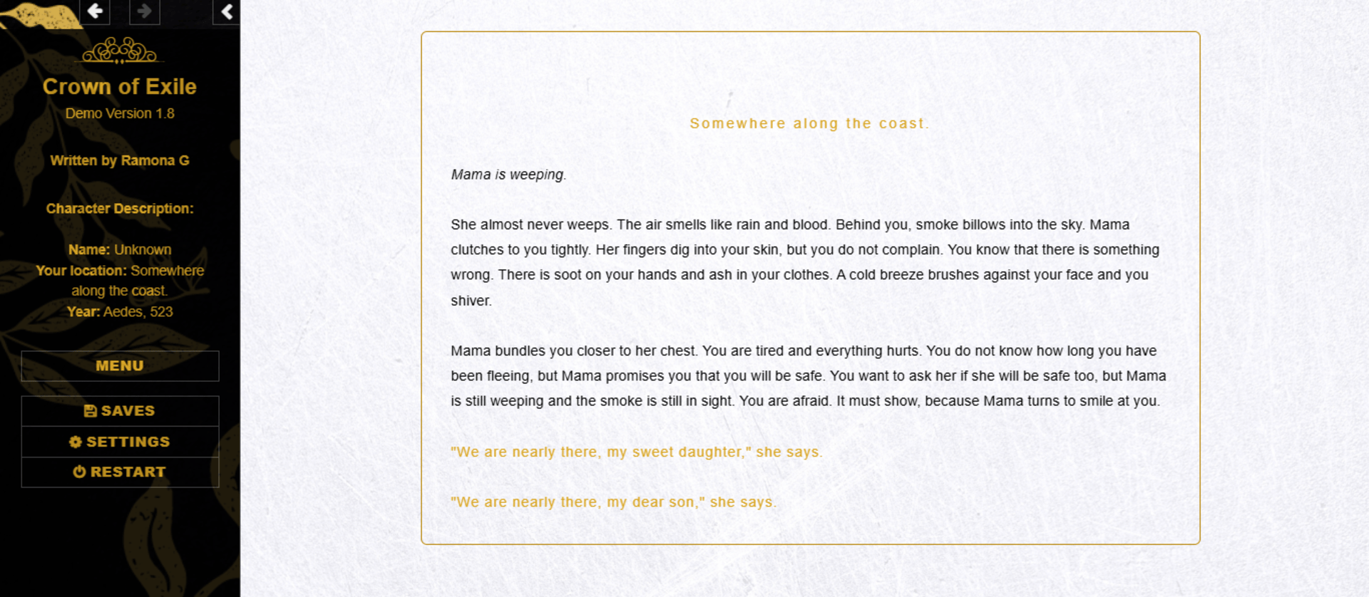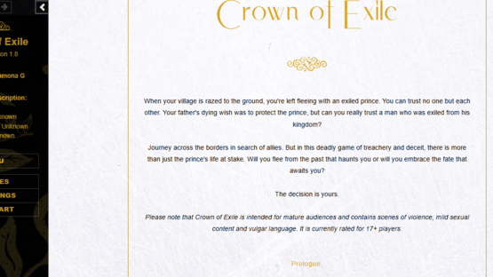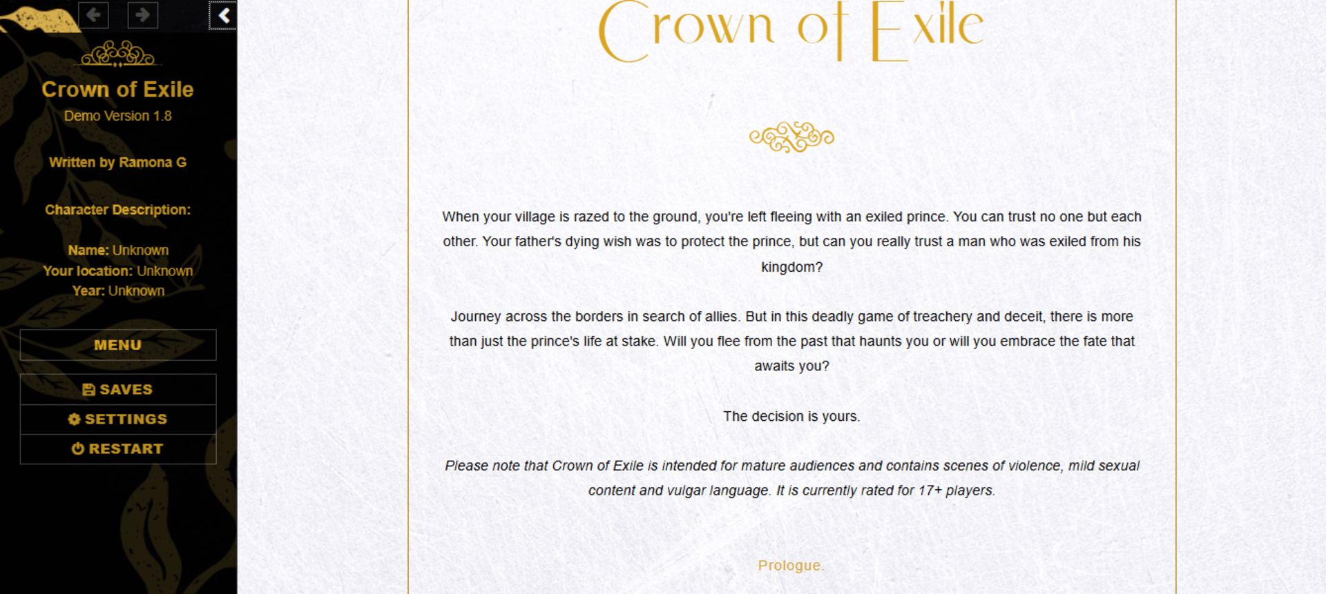 When your village is razed to the ground, you’re left fleeing with an exiled prince. You can trust no one but each other. Your father’s dying wish was to protect the prince, but can you really trust a man who was exiled from his kingdom? Journey across the borders in search of allies. But in this deadly game of treachery and deceit, there is more than just the prince’s life at stake. Will you flee from the past that haunts you or will you embrace the fate that awaits you? The decision is yours.