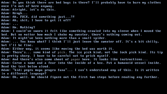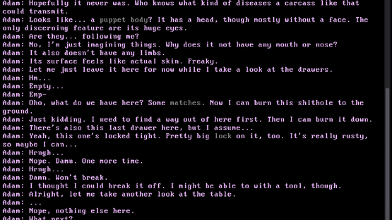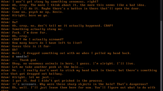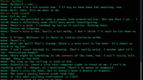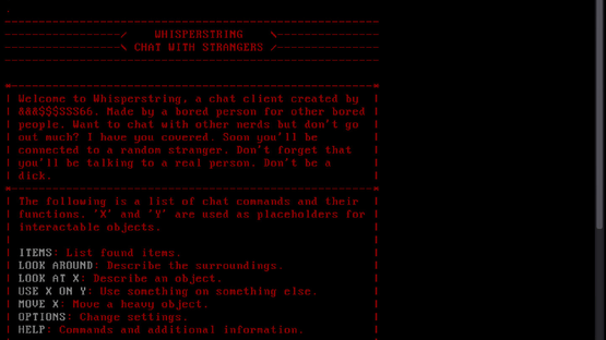 Whisperstring is an 80s inspired text adventure game that takes place inside a “chat room”. You’re connected to Adam, a "jock" with a severe fear of strings, who seems to have been the victim of a supernatural kidnapping. Will you be able to help him escape?