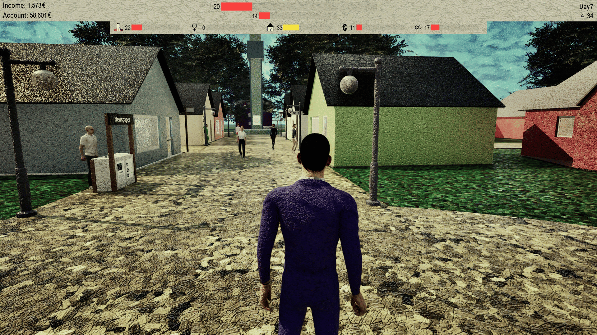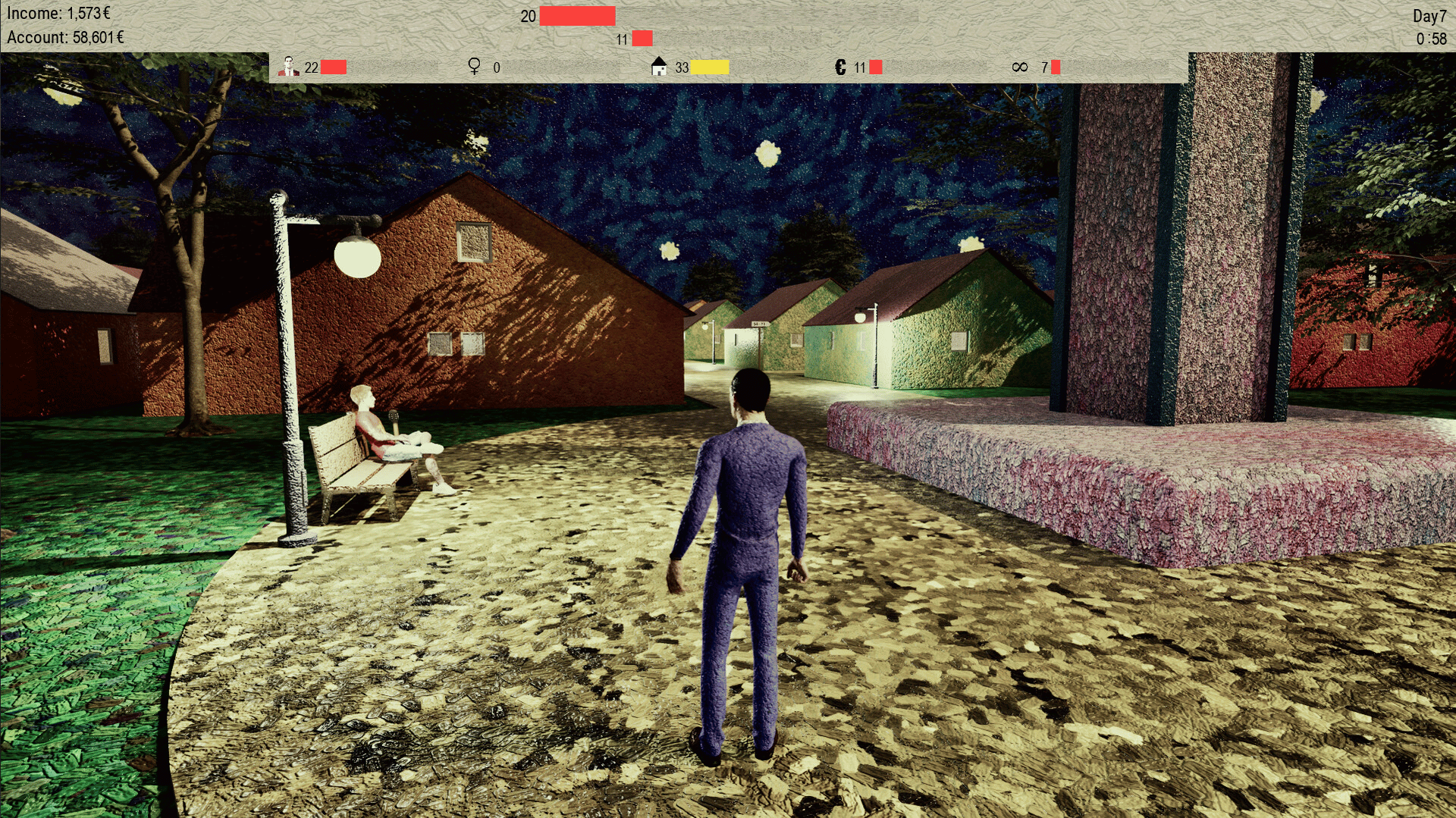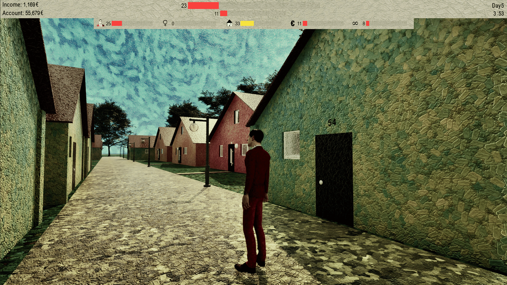 "Being John Gogh" is a life simulation game where you play as John, navigating through a world rendered in the style of Van Gogh's paintings, focusing on improving relationships, managing health, and enhancing charisma to find happiness on Bozca Island.