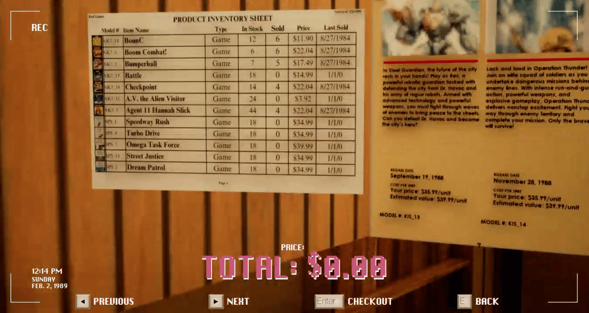 Build your own Video Game Store in 1984. Everyday until the end of 1989 gives you the opportunity to stock shelves, cycle your inventory, manage your prices, analyze historical trends to make your game store profitable. Use era-relevant technology and systems to prove that gaming has a future!