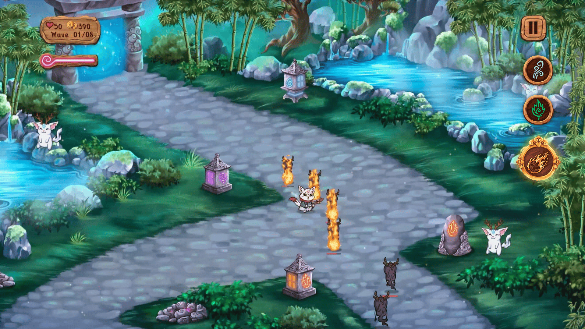 Protect the portals and aid the good spirits in this 2D tower defense game. Stop demons from invading by activating turrets along the paths. As the forest protector, use your speed and strategy to keep peace across the realms, transforming into the legendary nine-tailed fox to fulfill your destiny.
