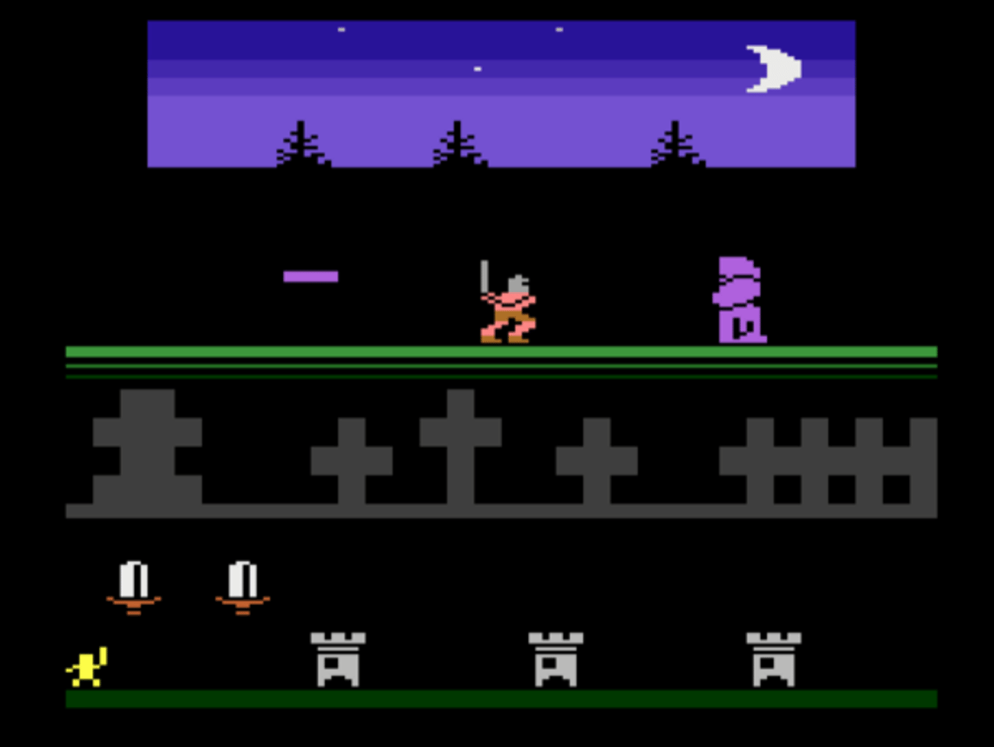 Terror reigns in The Old Kingdom. An evil sorcerer is ruling the land. Then one day, he is challenged by a barbarian Knight who is traveling from a foreign land to seek fame and fortune. You take control of the brave knight as you decide the fate of the Kingdom in this all-new Atari 2600 game. Fight your way through the forest and conquer the three castles he occupies to overthrow the evil sorcerer and become the new king.