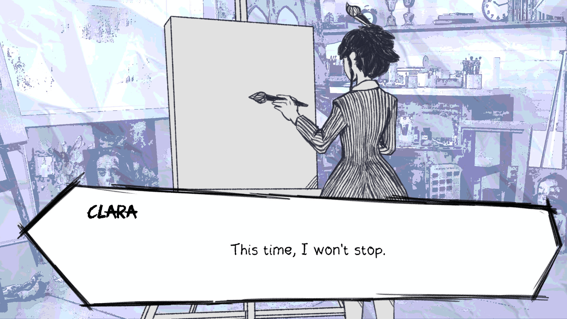 A narrative-driven visual novel where you help Clara, a struggling artist, overcome her creative block through painting mini-games and emotional choices in a surreal dream world.