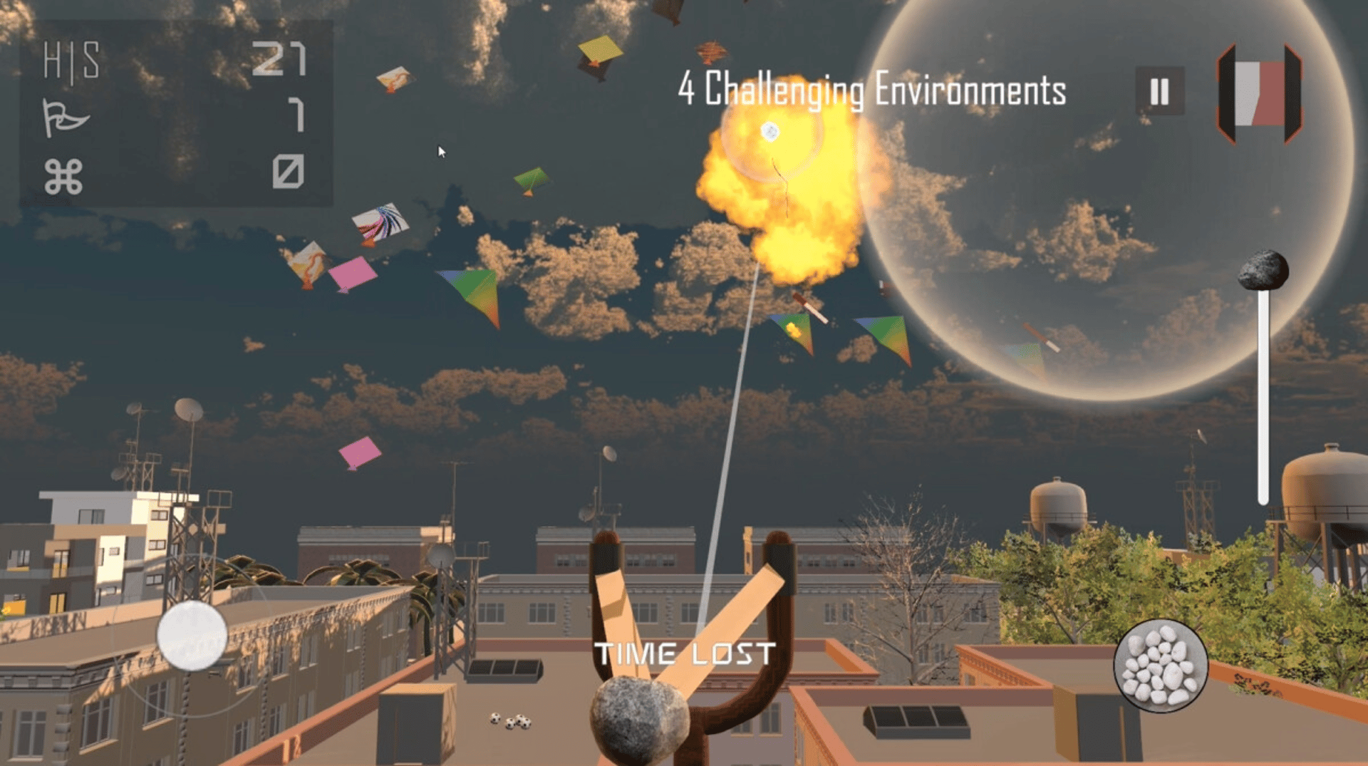 Aim for the skies and shoot down the kites. Witness the vivid skyline in rugged weather and lighting that challenge your aiming skills. Discover relics and upgrade munition in a race against time.