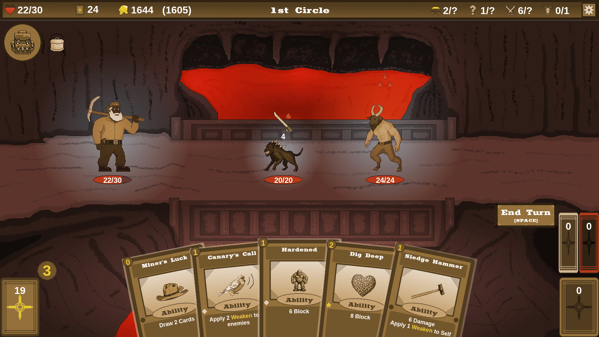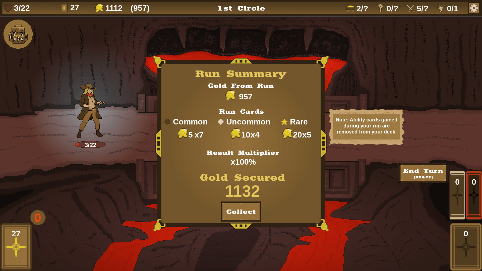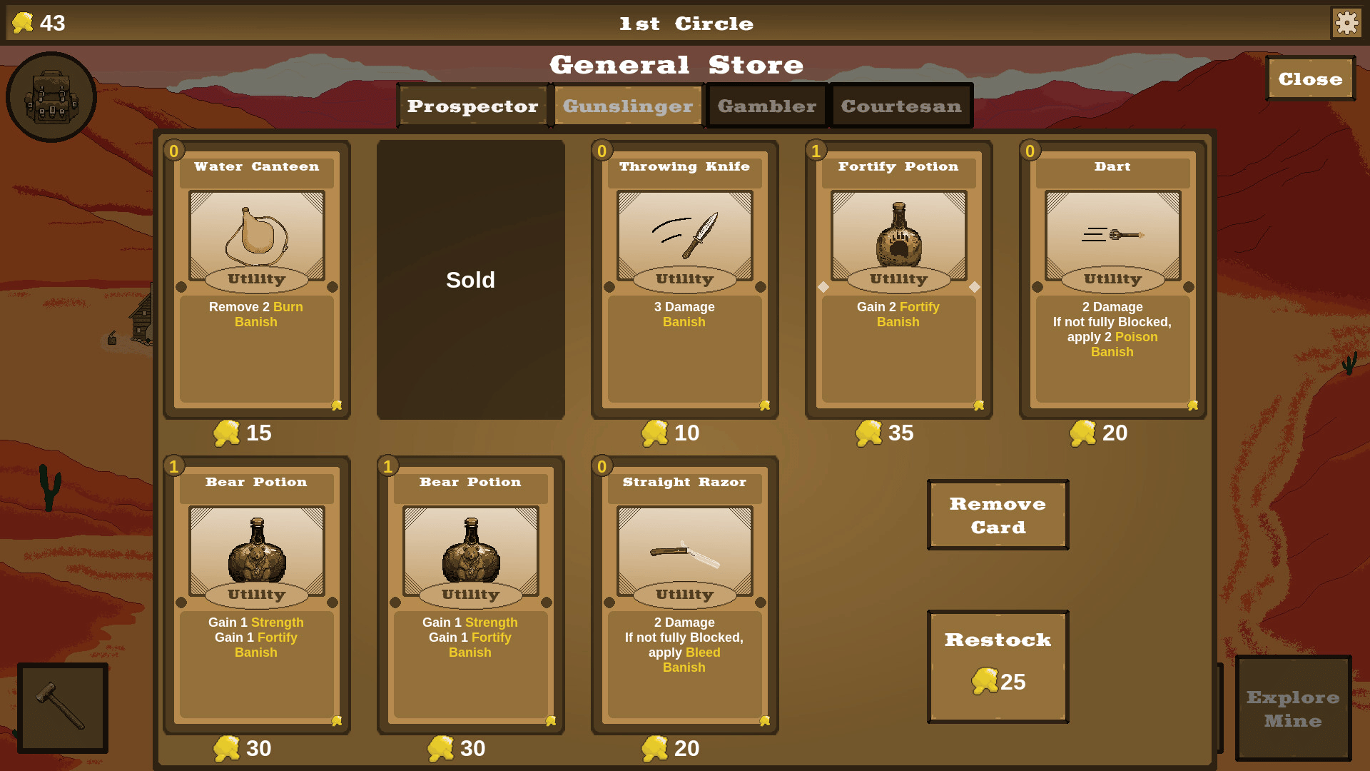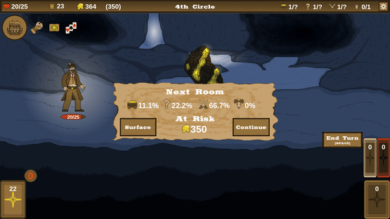 This roguelite deckbuilder is set in the American West. Battle monsters, cultists, and folkloric creatures while searching for gold and the source of the evil within a mine. You choose when to leave, not where to go. Will you play it safe returning to the surface, or risk it all by going deeper?
