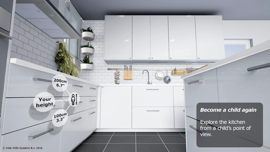 Explore and interact with an IKEA Kitchen in Virtual Reality! Walk around freely, open drawers and put your vegetable peelings in the waste sorting station. You can even enjoy the visual impact of different material finishes and experience things from a child’s point of view. This is the first time IKEA has offered a VR experience to our customers, so we'd love to get your input.