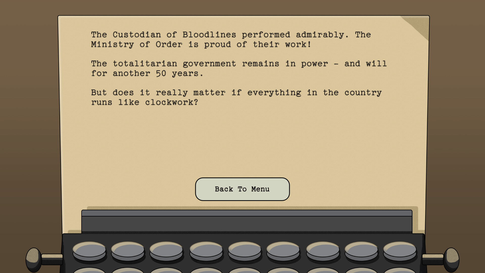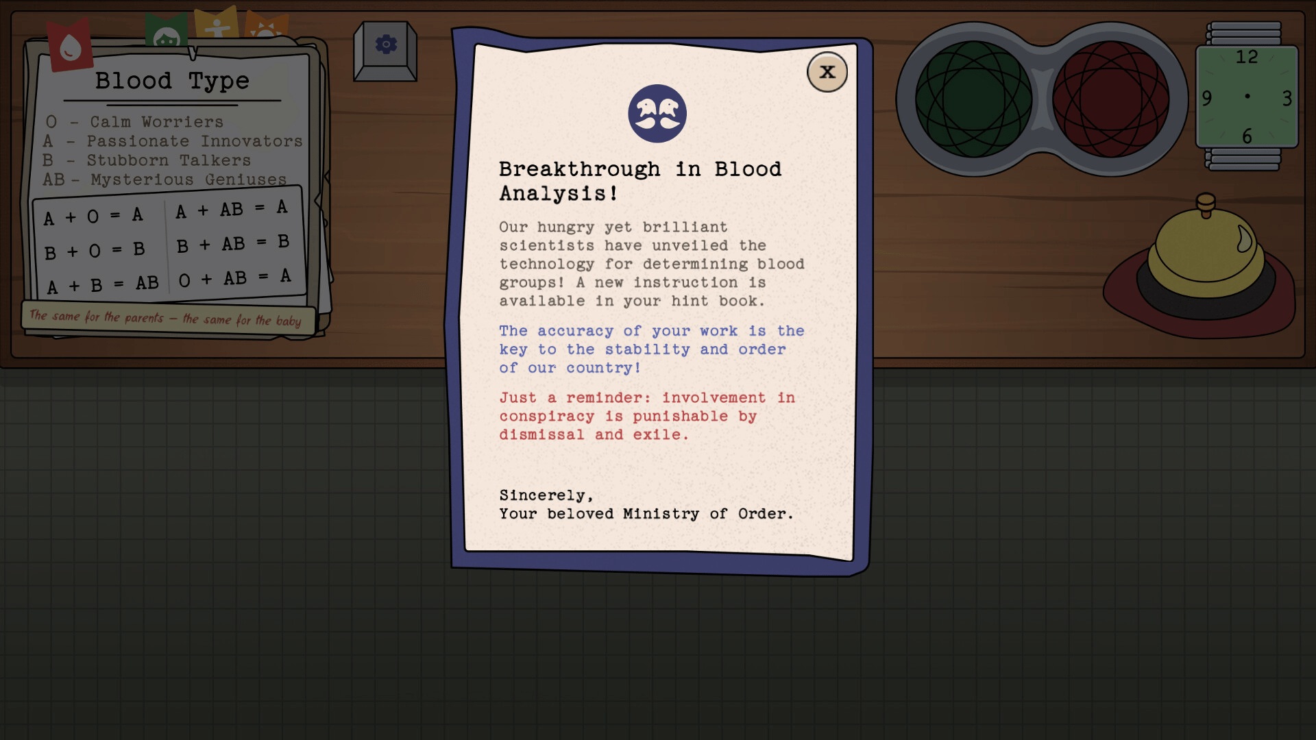 You’ve been assigned to the Maternity Ward in a totalitarian 1920s state. Reunite newborns with their rightful parents using a simplified genetics puzzle - no mistakes allowed. Obey the regime, join a secret conspiracy, or forge your own path.