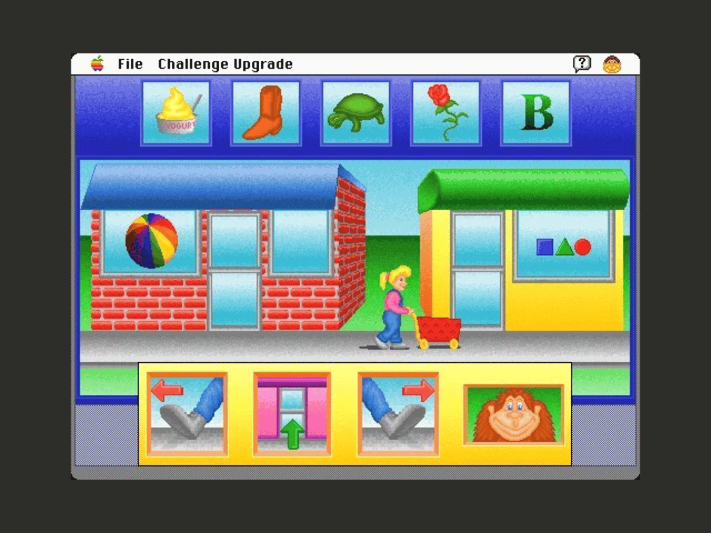 Easy Street is an educational shopping game. The player controls a small child who must travel Easy Street, to go to the local stores to buy the items on their shopping list. The player must choose which store is appropriate to buy the items on the top of the screen, entering the store, and choosing the correct item. On more difficult levels, the player must choose how much to pay for the item. To complicate matters, the player will get approached by Knuckles the Gorilla, and if he is able to hop onto the player's wagon, the player will not be able to enter any more stores, and must restart their shopping trip. When the player has gathered all required items, they can return home with their shopping complete.